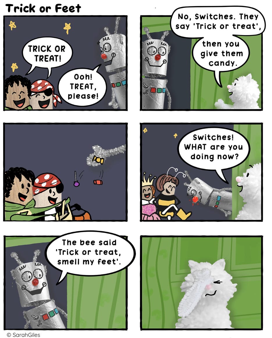 🍬But first, speaking of treats, we wanted to treat you all to a new Halloween Switches & Peeps 🤖🐱comic from fellow CoreToonist Sarah Giles: